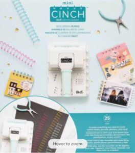 כורך ספירלה מיני סינץ’ Cinch מבית WE R MEMORY ממתכת בעל חורים עגולים מתאים לכריכת אלבומים, מחברות, יומנים, פנקסים ועוד. בעזרת המכשיר ניתן לחורר חורים במספר דפים יחד ואז לקבע את הספירלה למקום.