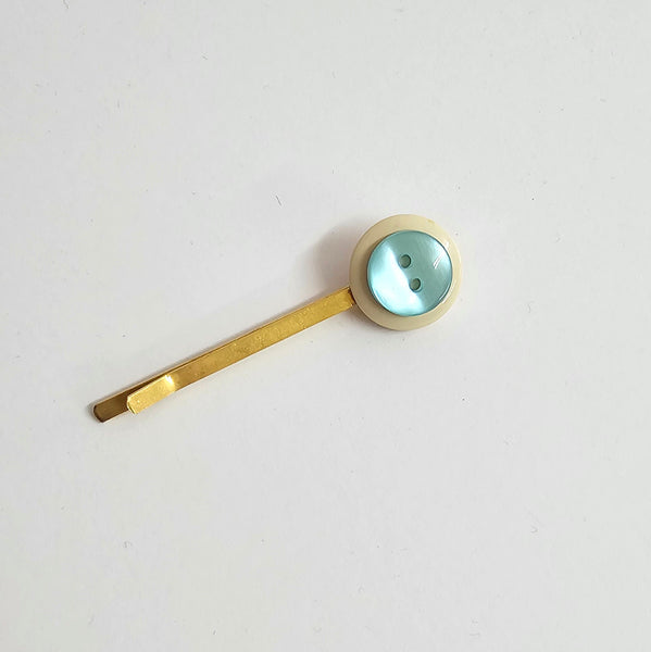 סיכת ראש מוזהבת עם כפתור לבן ותכלת.