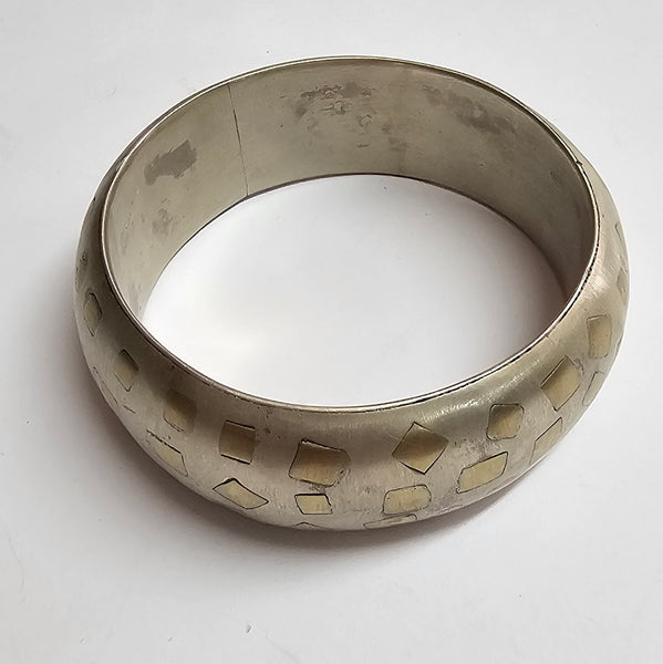 צמיד כסף רחב סגור ועבה עשוי בעבודת יד משובץ בריבועי זהב למראה ייחודי ומקורי.