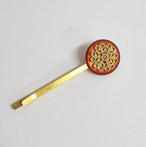 סיכת ראש מוזהבת בסגנון תחרה עם כפתור בצבע בורדו מבריק.